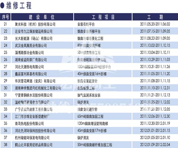 宏順建設(shè)工程有限公司是國家批準成立的專業(yè)高空作業(yè)企業(yè):承攬過(國內(nèi).國外)煙囪新建、煙囪防腐、吊機防腐、水塔防腐、管道防腐、龍門吊防腐、儲存罐防腐、煙囪內(nèi)壁防腐等高空作業(yè)工程。具有“不搭腳手架 、 不需要停產(chǎn)”施工特點。